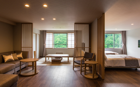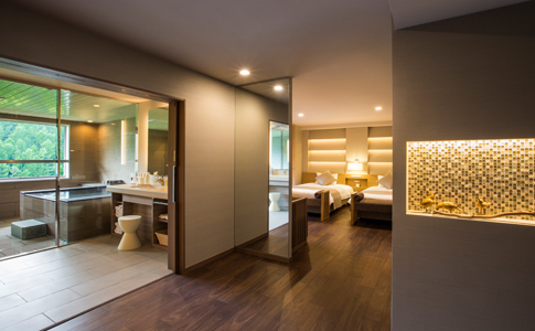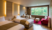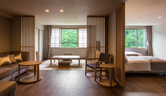 最上階11階、展望風呂を備えた当館最高級のスイートルーム。窓いっぱいに広がる自然と源泉かけ流しの湯を独り占めできます。