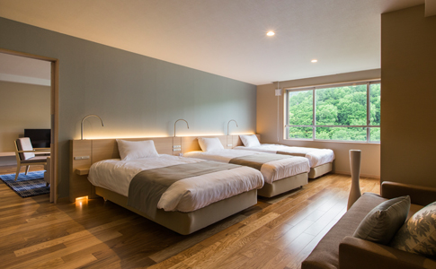 レディースルームのプレミアム客室です。ベッド3台の寝室とゆとりのリビングスペースがございます。