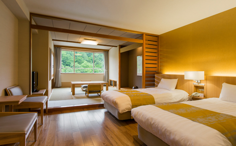 10畳和室とツインベッドルームを備えたスタンダード客室。シックなインテリアと和の設えが落ち着いた空間を演出します。