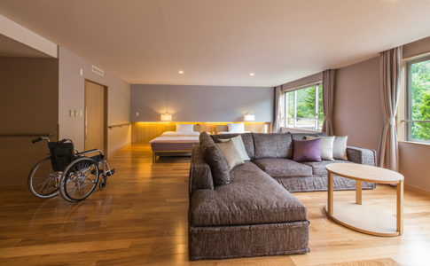 一切の仕切りがない開放的なフラットタイプ客室です。車椅子の方にもストレスのない余裕の導線を確保しました。