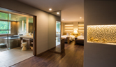 76㎡の広さを最大限に生かした和洋室。大きなソファと琉球畳の和室を設え、ワンランク上の寛ぎを演出します。