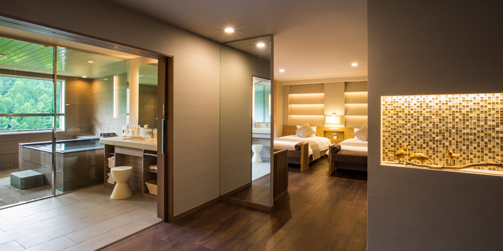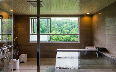 ガラス扉の開放的な浴室では、窓いっぱいに広がる自然を眼下に望み、源泉かけ流しの湯を独り占めできます。